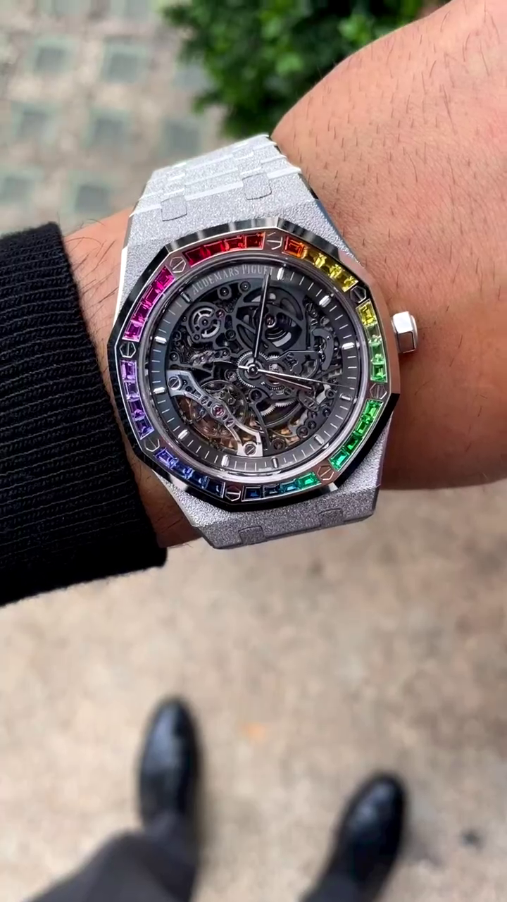 Its signature frosted gold finish lends the white gold case a refined, shimmering texture, balancing luxury with contemporary edge. Accentuated by vibrant “Rainbow” detailing—often showcased through gemstones or multicolored accents—the watch delivers a striking contrast between technical mastery and expressive design.