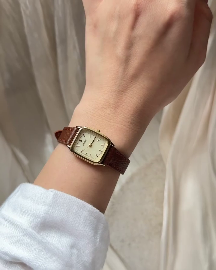 A truly classic timepiece, this vintage Seiko Quartz watch embodies timeless sophistication with refined design and precision craftsmanship. Crafted with a gold-tone rectangular case and paired with a rich brown leather strap, this watch reflects understated elegance that transcends trends — perfect for collectors, style enthusiasts, and anyone who appreciates heritage horology.