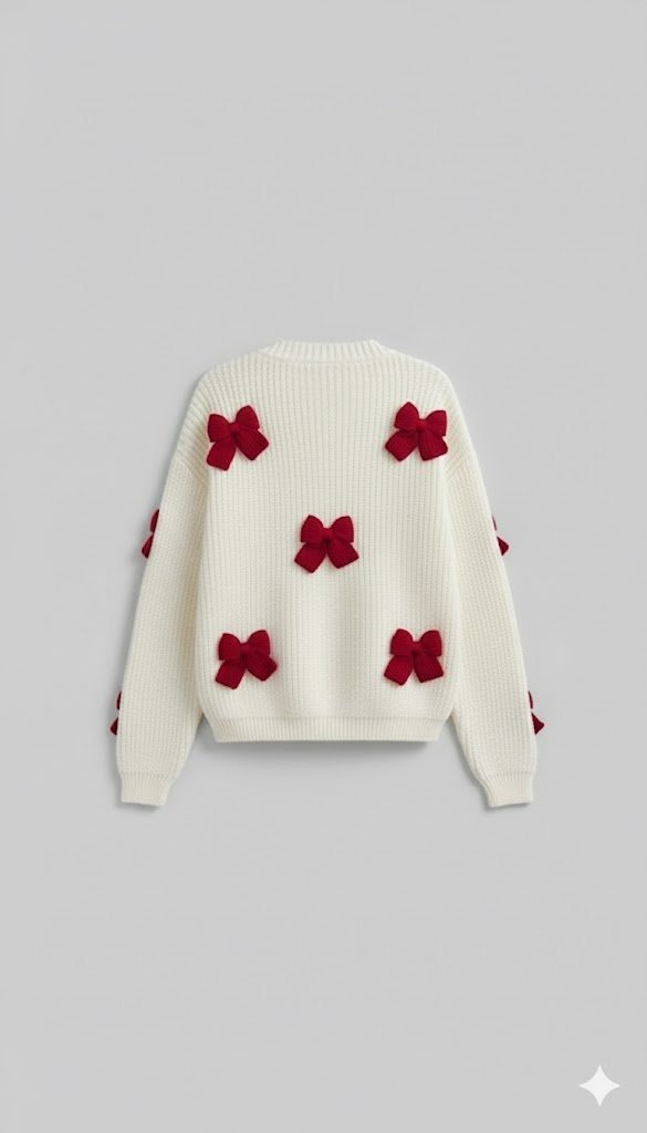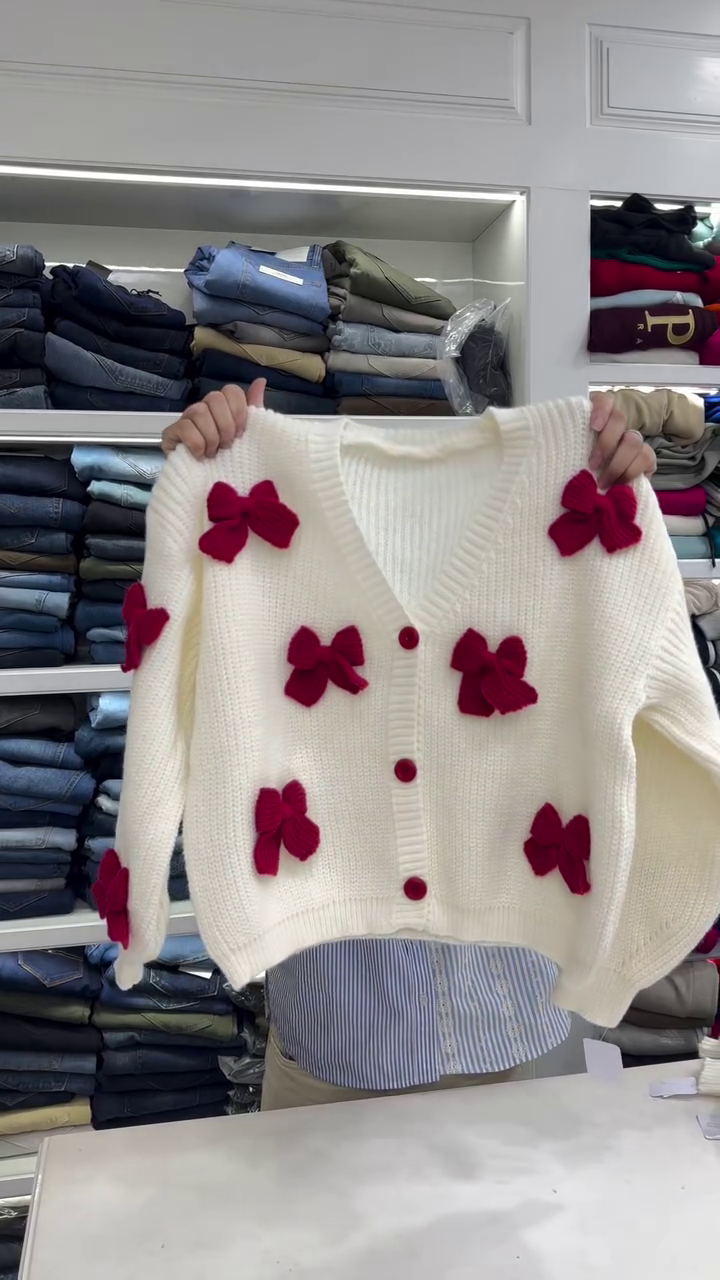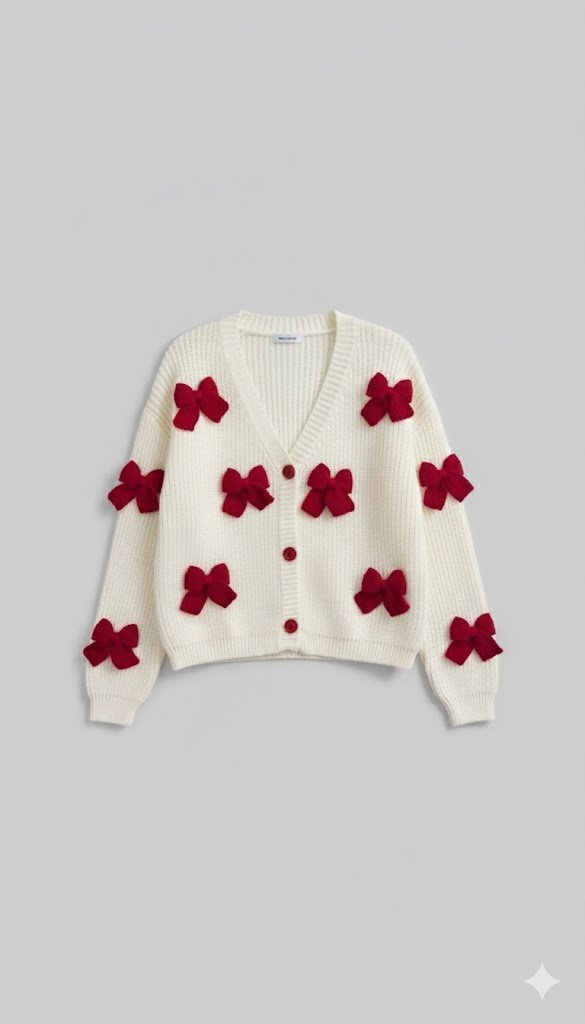 Ideal for everyday wear, festive occasions, or casual outings, the white knit cardigan with red bows is perfect for women who want cozy knitwear with a charming, eye-catching twist.