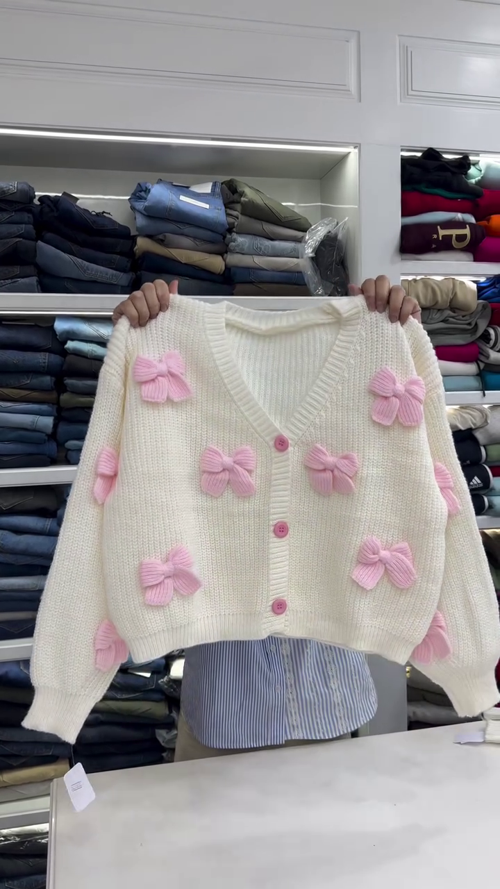 Add a touch of playful elegance to your wardrobe with this White Knit Cardigan with Red Bows. Designed for women who love feminine detailing and cozy comfort, this cardigan blends classic knitwear with charming accents for a versatile, standout piece.